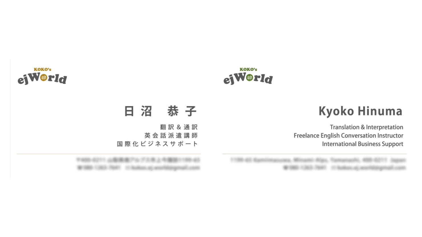 山梨県の南アルプス市で英語教室をしているKOKO’s ejWorld様の名刺です。