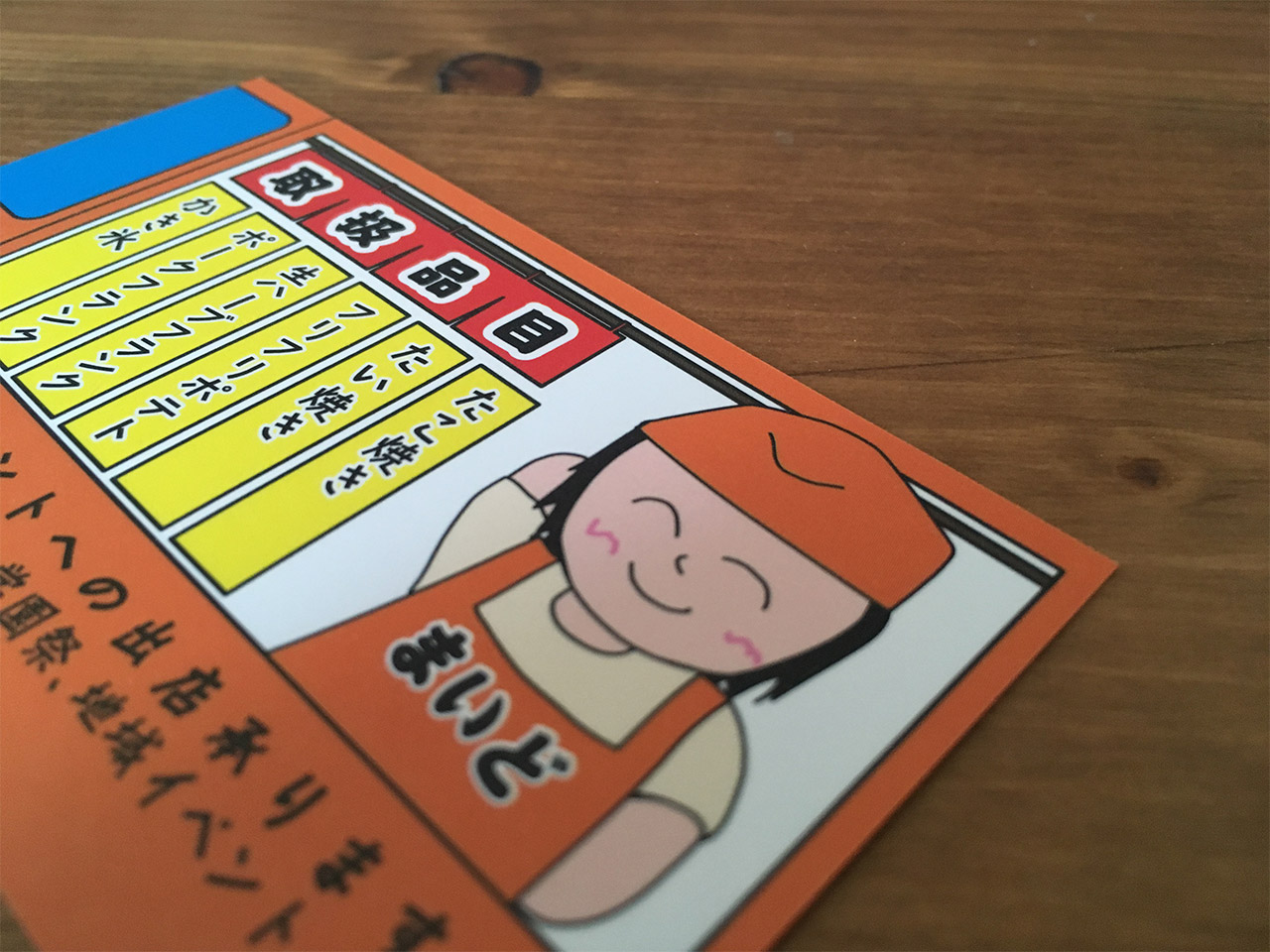 移動販売車のトラックをモチーフにして、中にはスタッフのイラスト。このイラストには別バージョンもあったのですが、社長のお子様が直々に描いてくれたということでこの手描きイラストを採用。片面は取り扱う品目や宣伝文句、そしてイラスト。もう片面は4名分の個人情報になります。