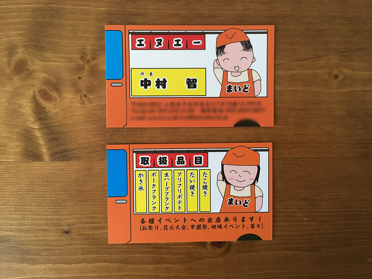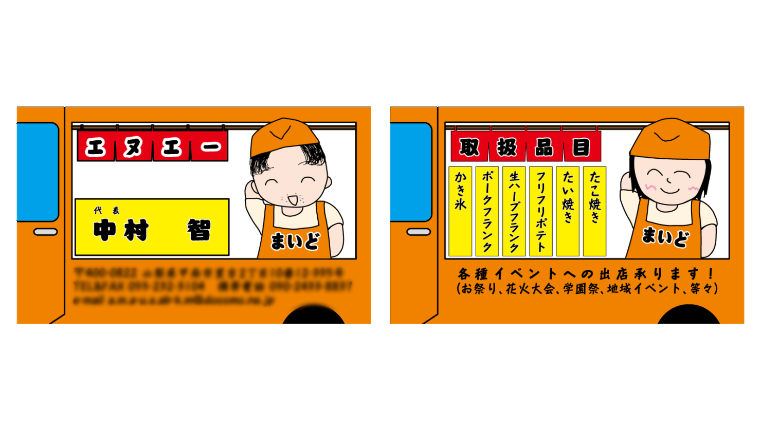 山梨県内各地で移動販売車による、たこ焼き・たい焼き・からあげの販売や、お祭りなどに出店している会社エヌエー(まいど)様の名刺です。