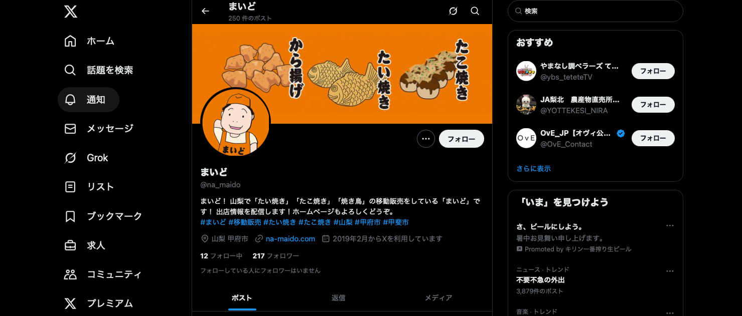 山梨県内各地で移動販売車による、たこ焼き・たい焼き・からあげの販売や、お祭りなどに出店している会社エヌエー(まいど)様のX(旧Twitter)のカバー画像です。
