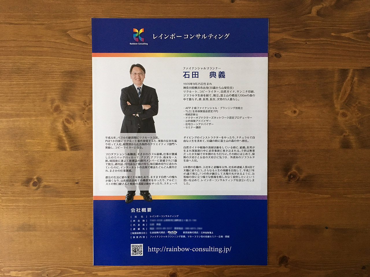 山梨県河口湖町の保険をメインにしたコンサルティングの会社 株式会社レインボーコンサルティング様のパンフレットです。