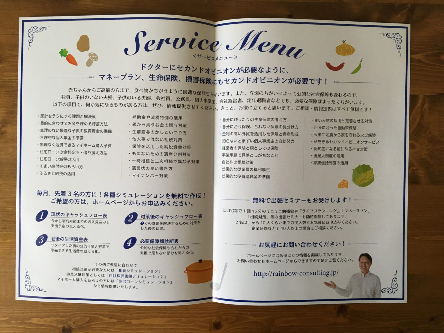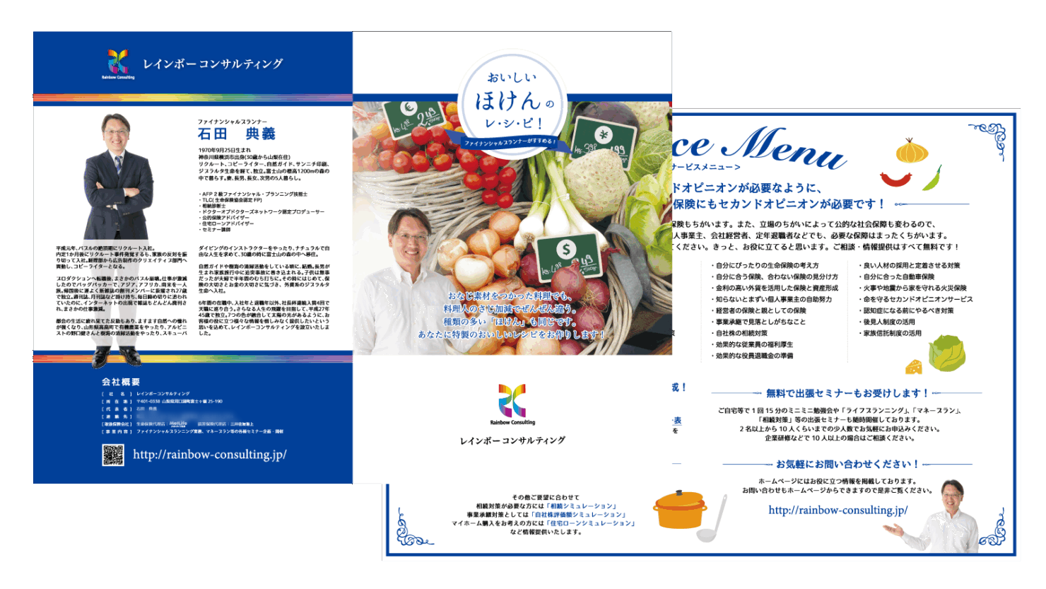 「ほけんのレシピ」というタイトルをつけ、パンフレットをレストランのメニューに見立てて、保険で提供できるサービスをレシピとしてみなさまに提供するといった雰囲気のデザインにしました。多くの職種を経験したクライアントご自身が元々コピーライターだったこともあり、文字原稿の提供はスムーズでした。